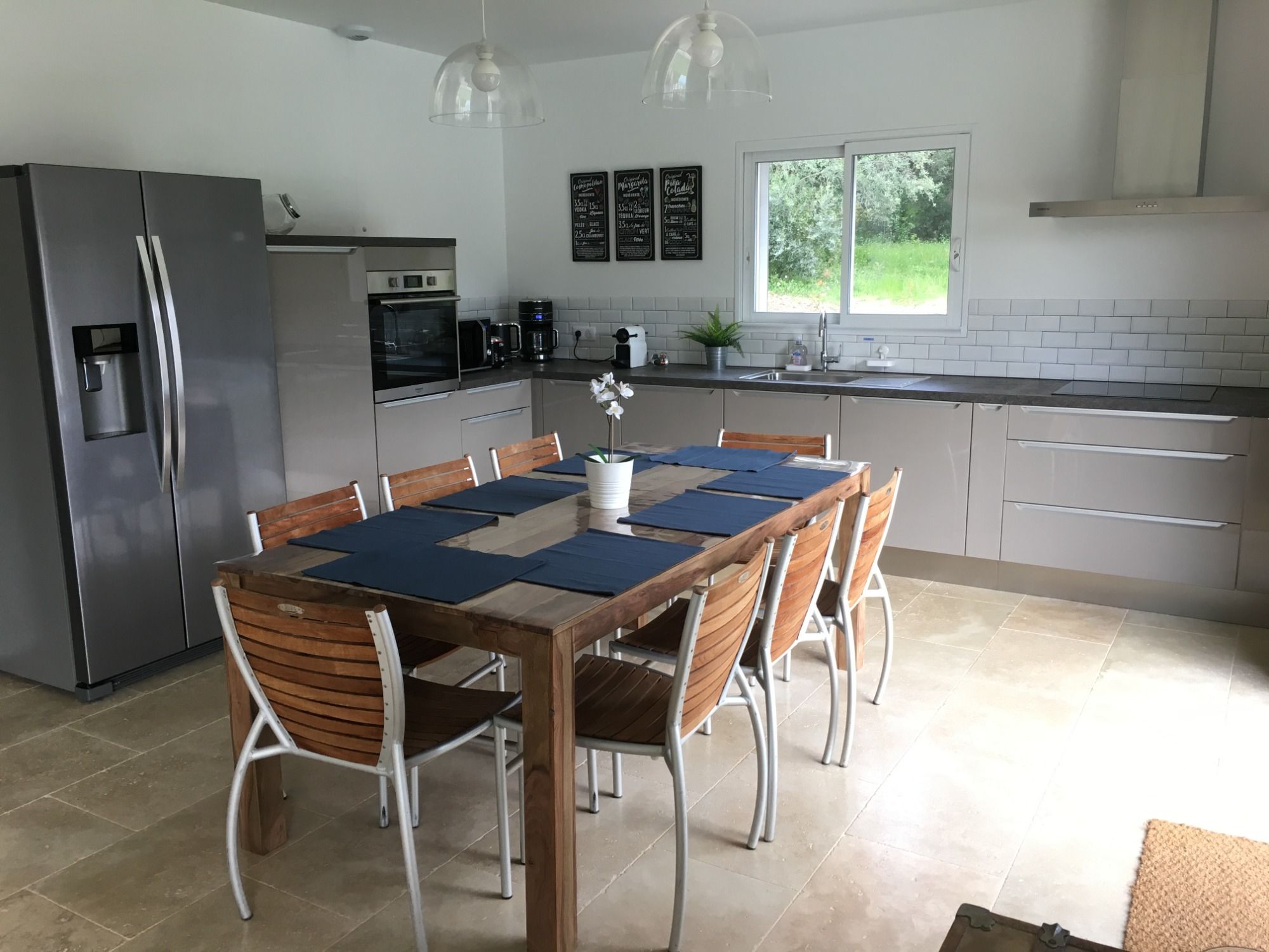 Deux cuisines, entièrement équipées, donnent sur un vaste séjour où de larges baies vitrées s'ouvrent sur la terrasse couverte et la piscine.